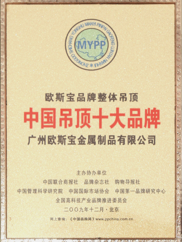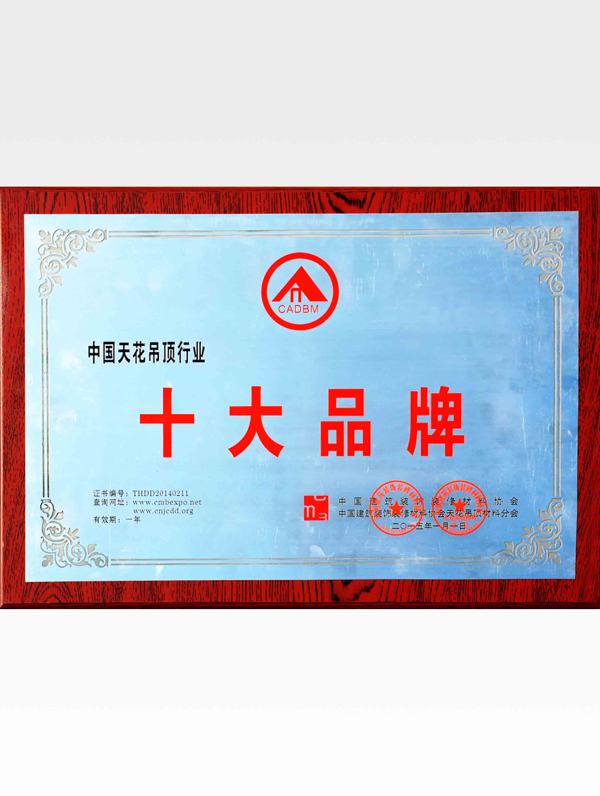 2016年,榮獲“2015—2016年度中國十佳吊頂品牌”榮譽證書;