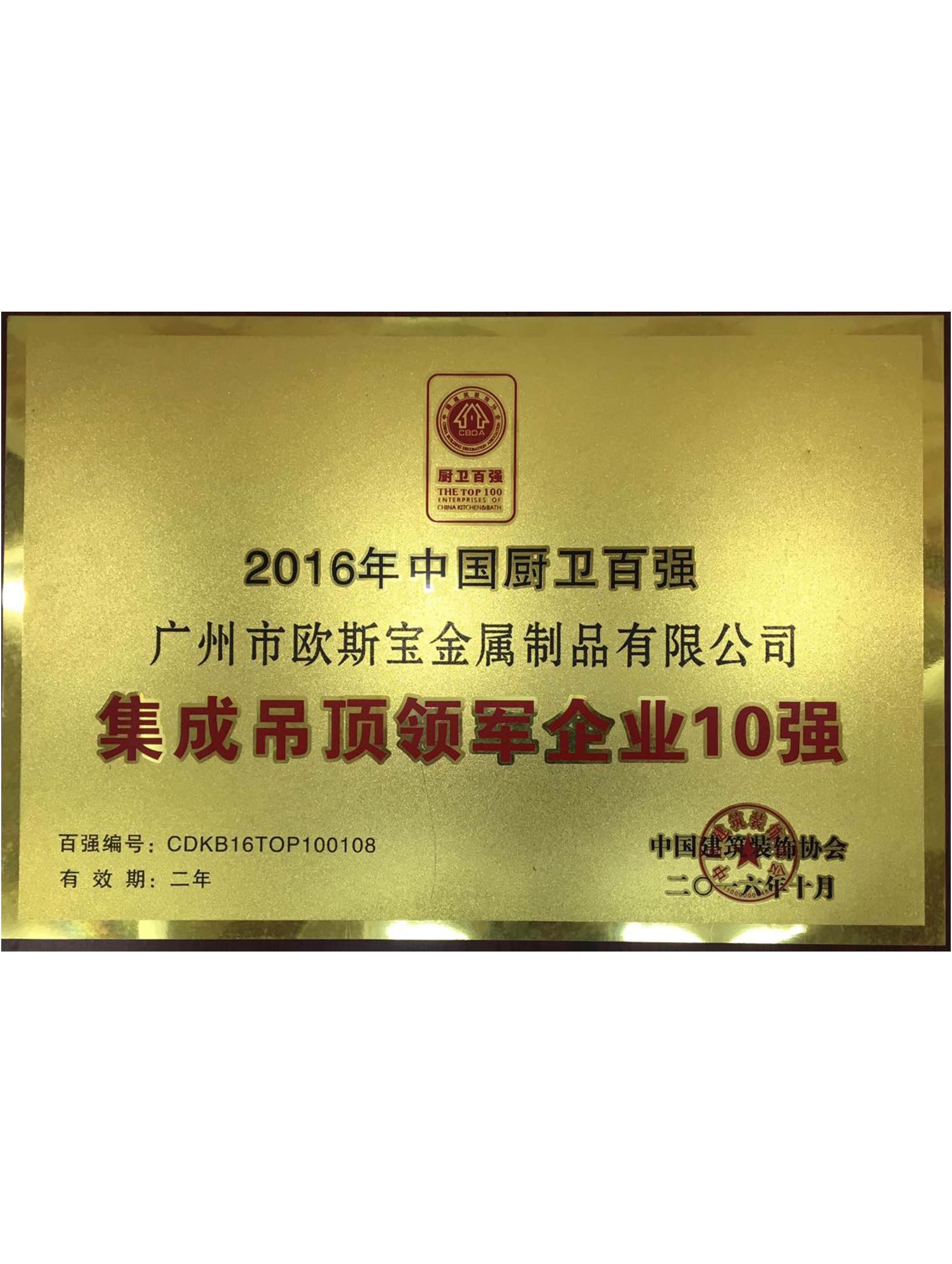 2016年,榮獲中國廚衛(wèi)百強“集成吊頂領(lǐng)軍企業(yè)十強”榮譽稱號
