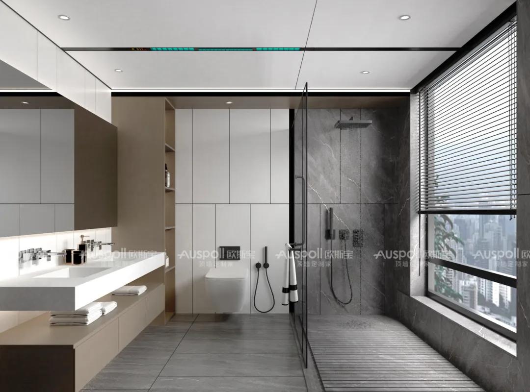 還能完美隱藏頂部的線(xiàn)路管道,搭配時(shí)尚簡(jiǎn)約的浴室空調(diào),打造舒適健康清爽的沐浴環(huán)境。