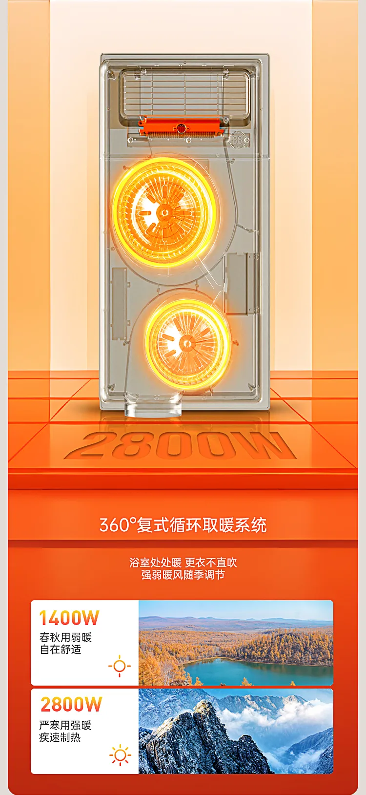 升溫快,洗澡再也不用等,強勁高效雙電機動力系統,2800w超大功率的PTC,高、低兩檔檔位自由選擇。