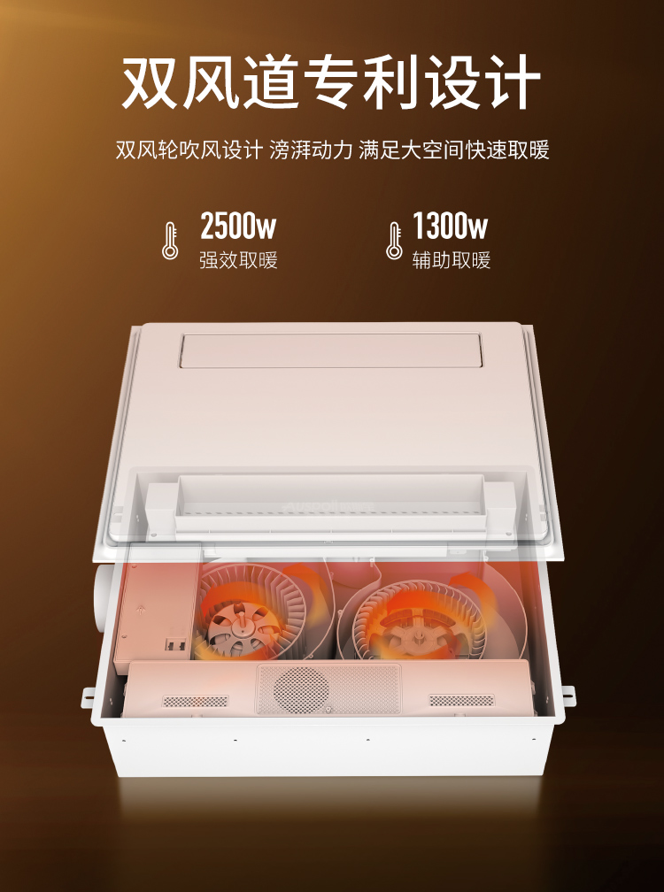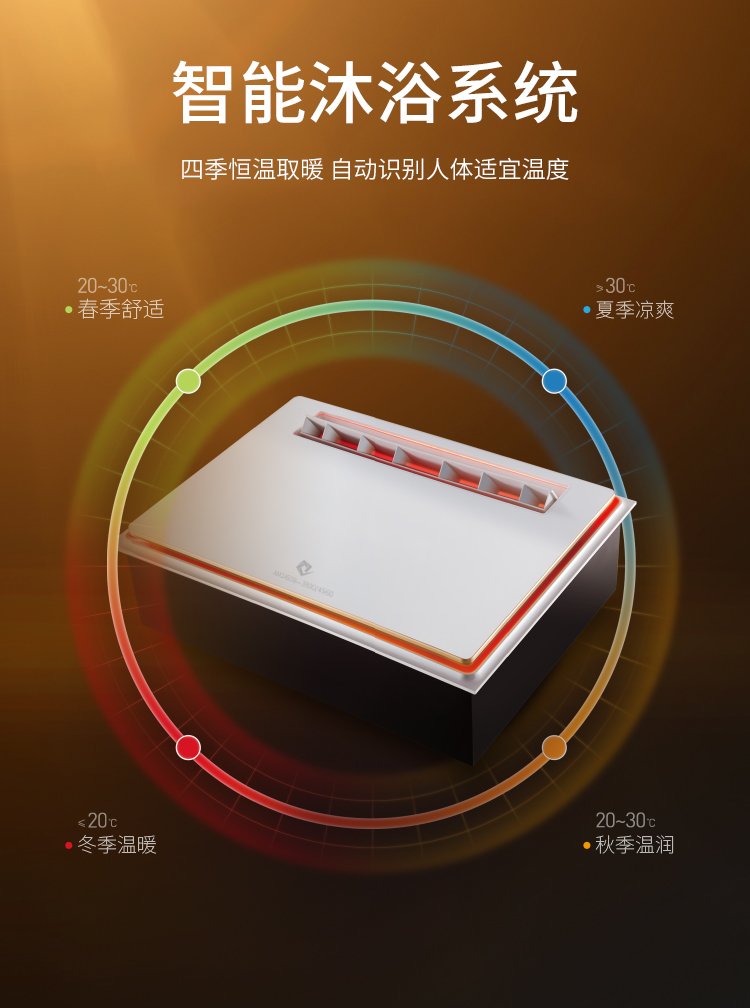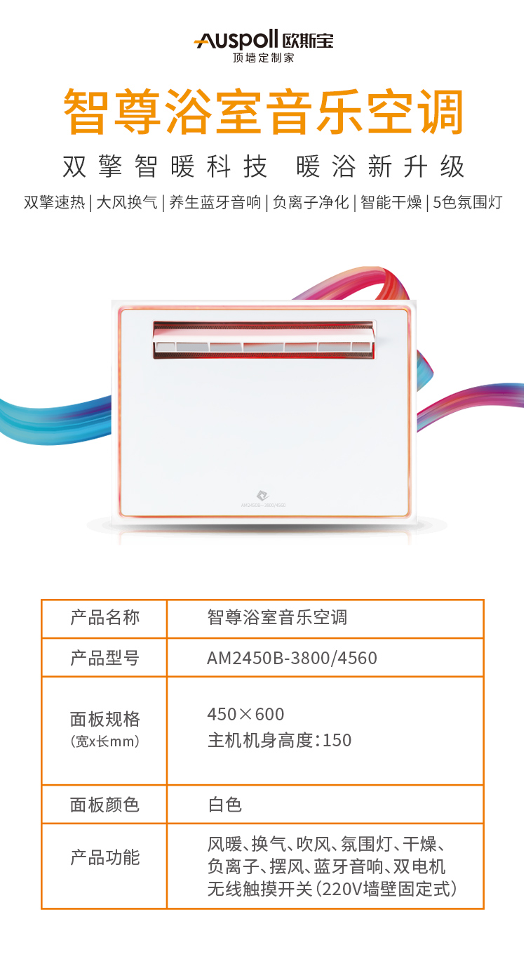 沐浴時刻,怎能少了“天籟”。智尊浴室空調是歐斯寶2019年新推出的多功能旗艦電器,集取暖、換氣吹風、智能沐浴、藍牙音響、氛圍燈、負離子、擺風等多功能于一體 ,采用高品質養生音響,DSP環繞技術,讓您步入沐浴新時代。你有多精致,沐浴時光就要有多浪漫。